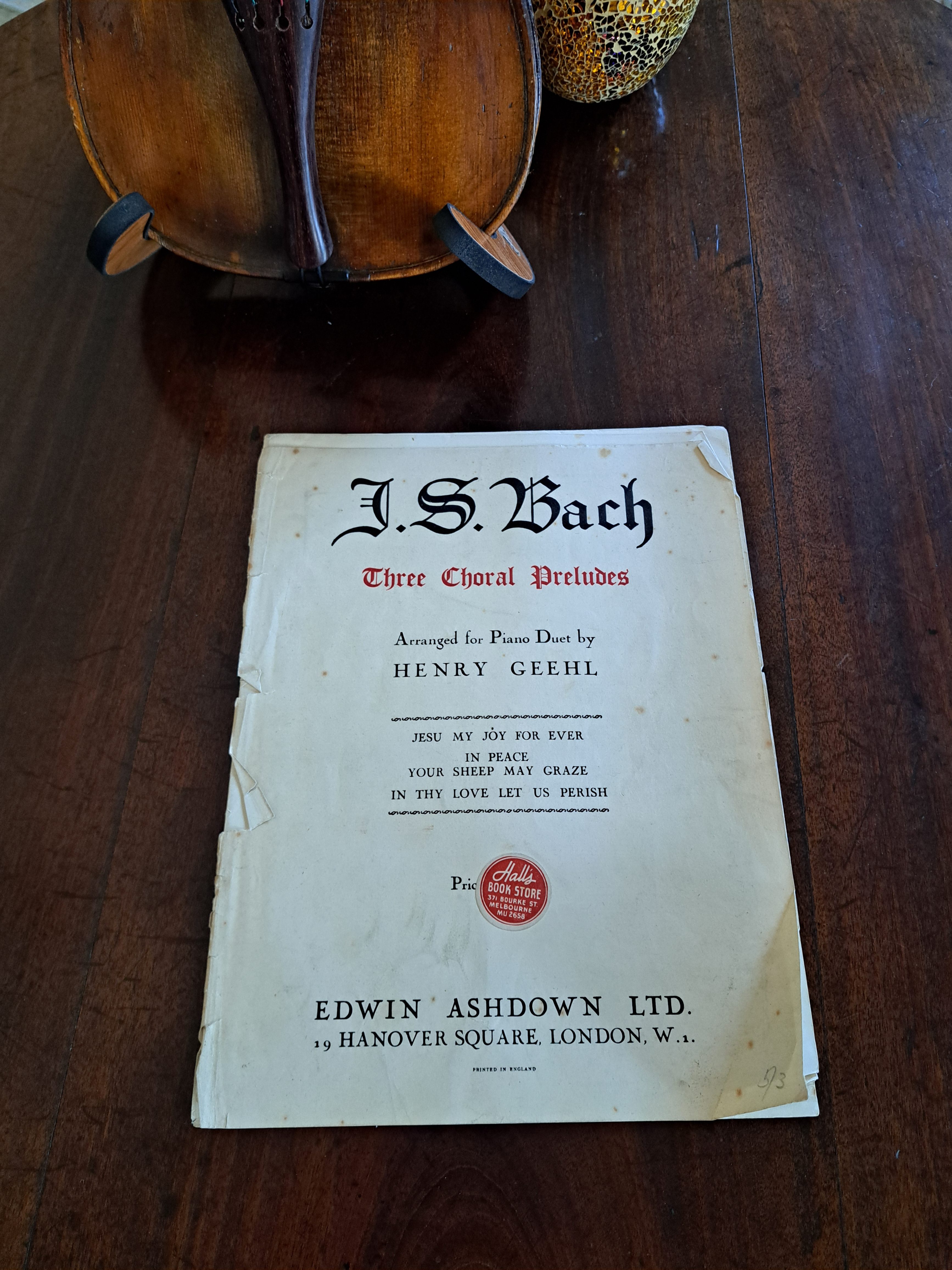 Sheet music. Bach – Three Choral Preludes. Arranged for Piano Duet by Henry Geehl. 17 pages. Spine needs taping.
