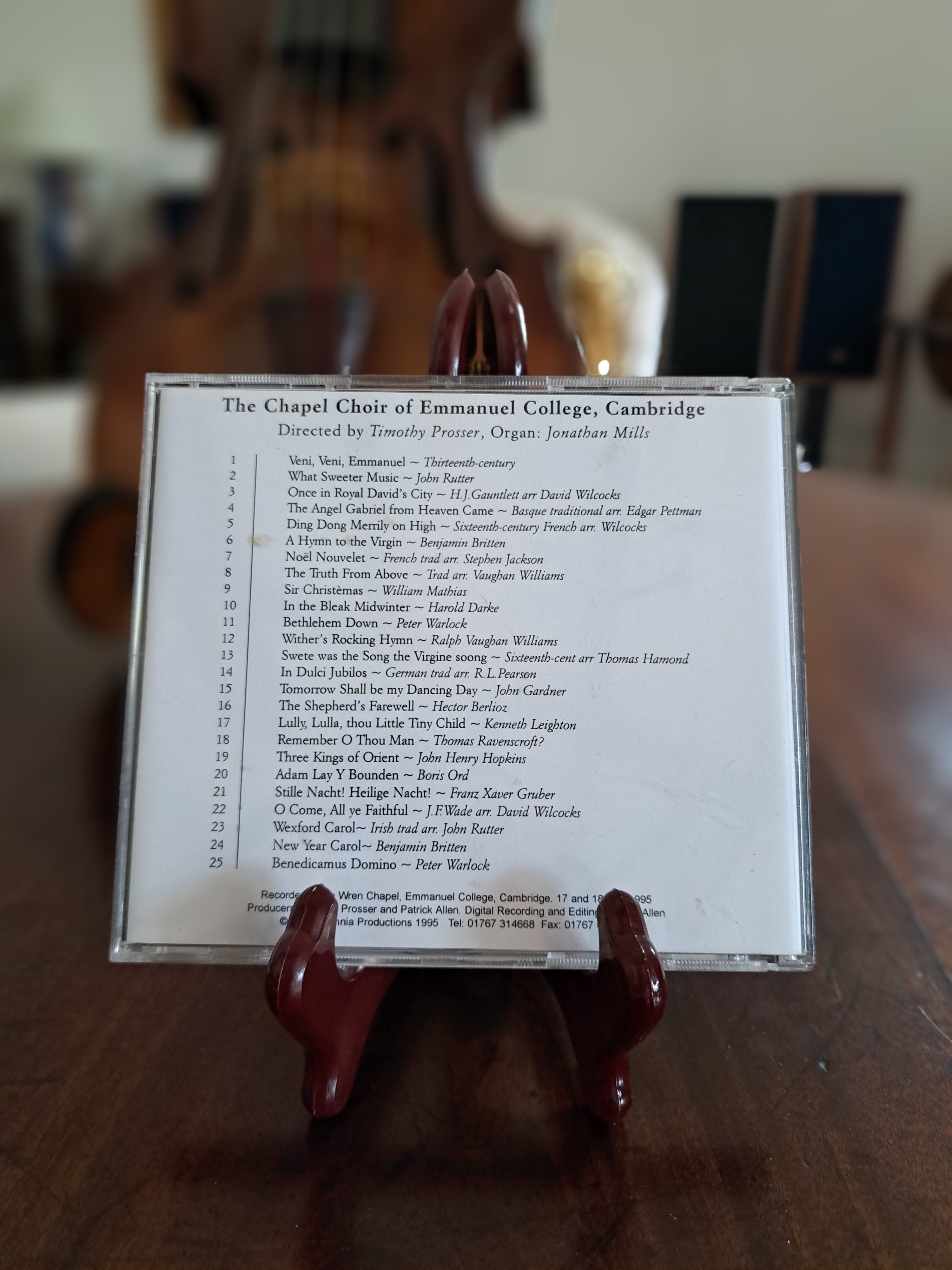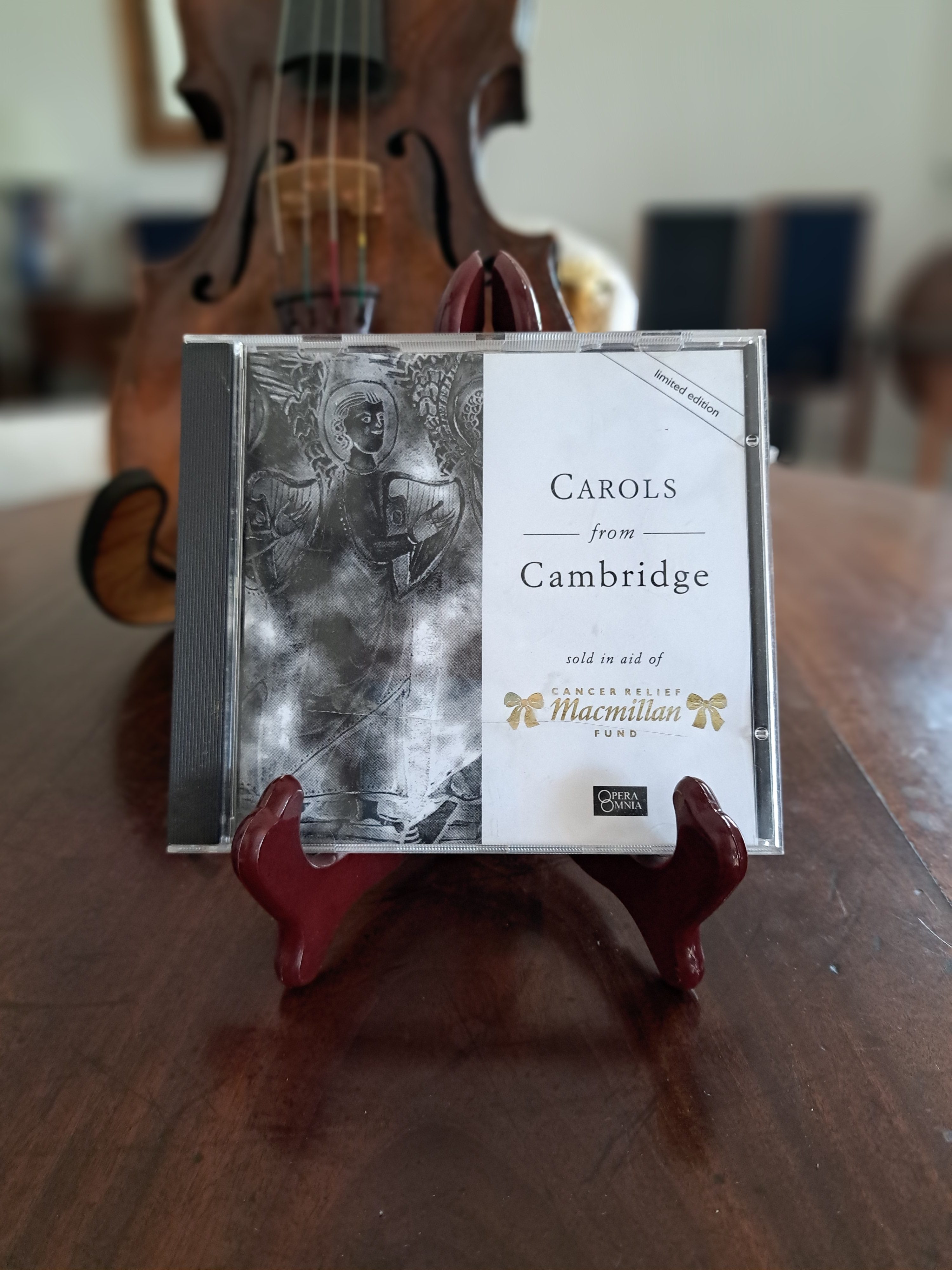 Limited edition CD – Carols from Cambridge by Opera Omnia. 25 tracks. Recorded in the Wren Chapel, Emmanuel college, Cambridge in July 1995. Organ: Jonathan Mills. Originally produced in id of the Macmillan Cancer Relief Fund.