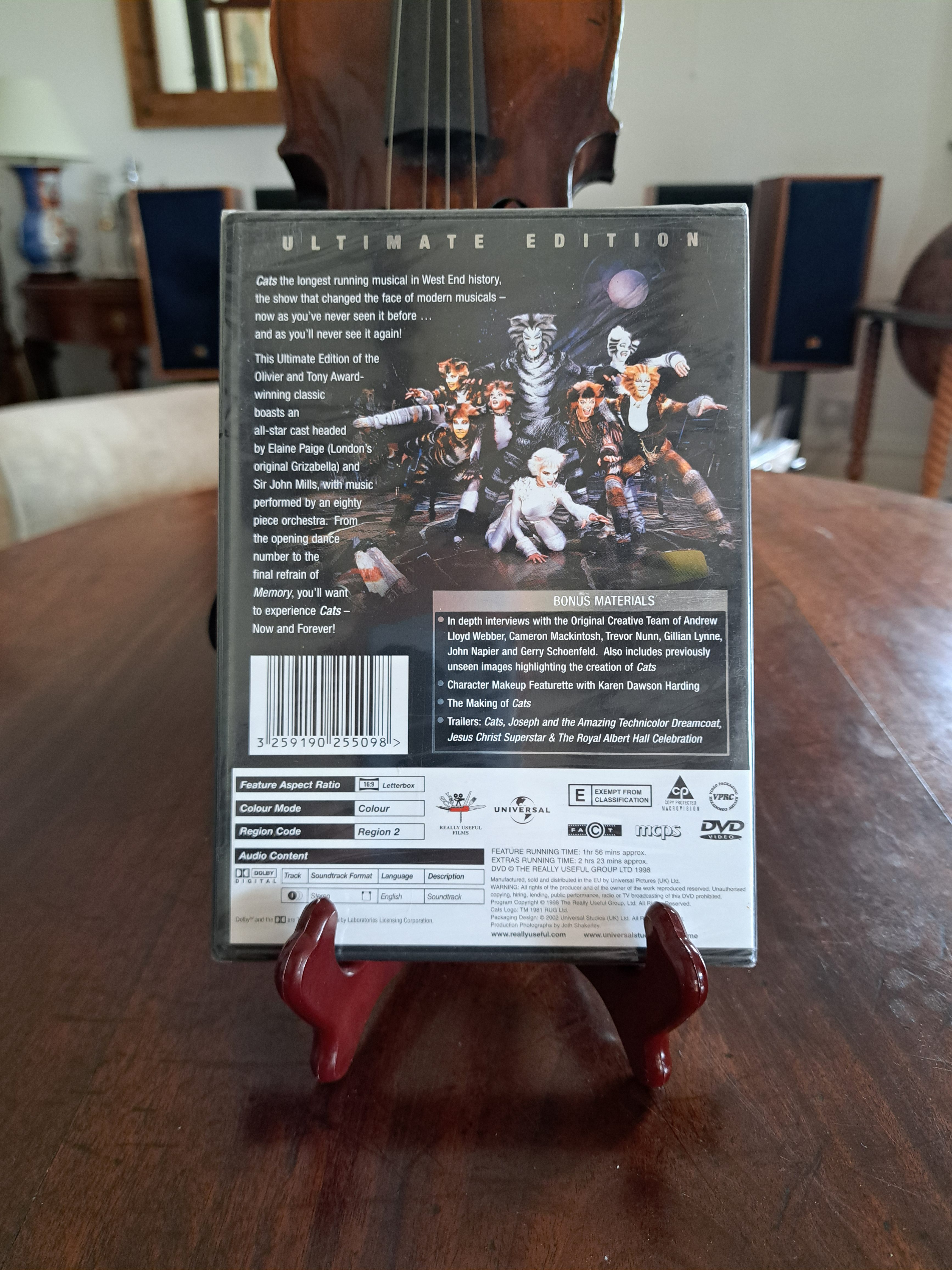 DVD, still sealed. Cats, Ultimate Edition. Includes bonus materials. Widescreen letterbox. Cats – the longest running musical in West End history, the show that changed the face of modern musicals. Andrew Lloyd Webber at his best. 1 hour 56 minutes. Extras running time 2 hours 23 minutes. The all-star cast headed by Elaine Page n Sir John Mills with music performed by an eighty piece orchestra.