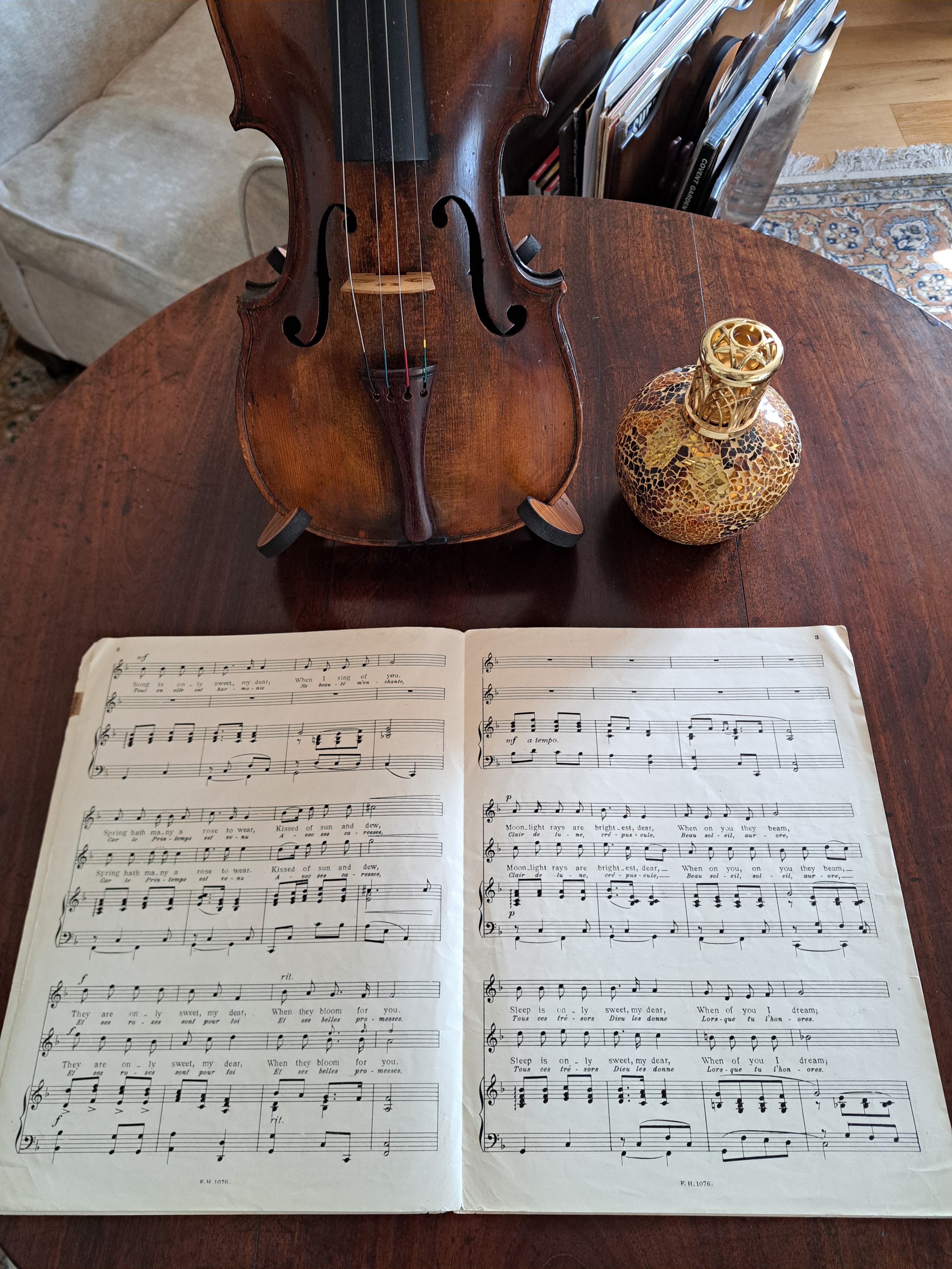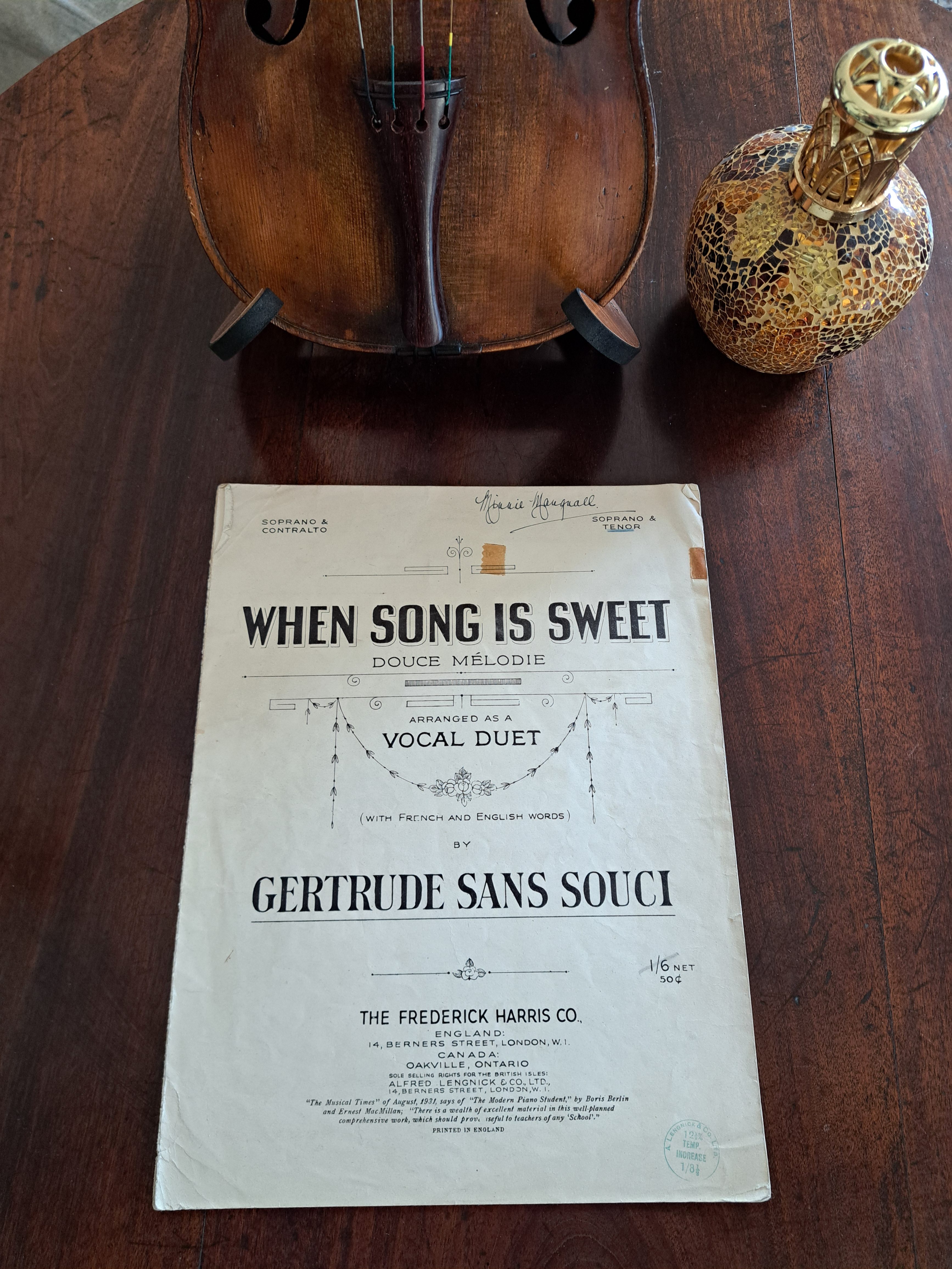 Sheet music. 4 pages. Loose sheets. When song is Sweet by Gertrude Sans Souci – With French and English words. Arranged as a vocal duet. Soprano and Tenor.