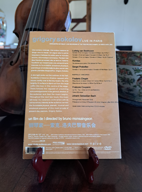 DVD directed by Bruno Monsaingeon as a live recording of Grigory Sokolov playing Beethoven, Prokoviev, Chopin and Bach at the Theatre Des Champs-Elysees on 4 November 2002. A superb recording.
