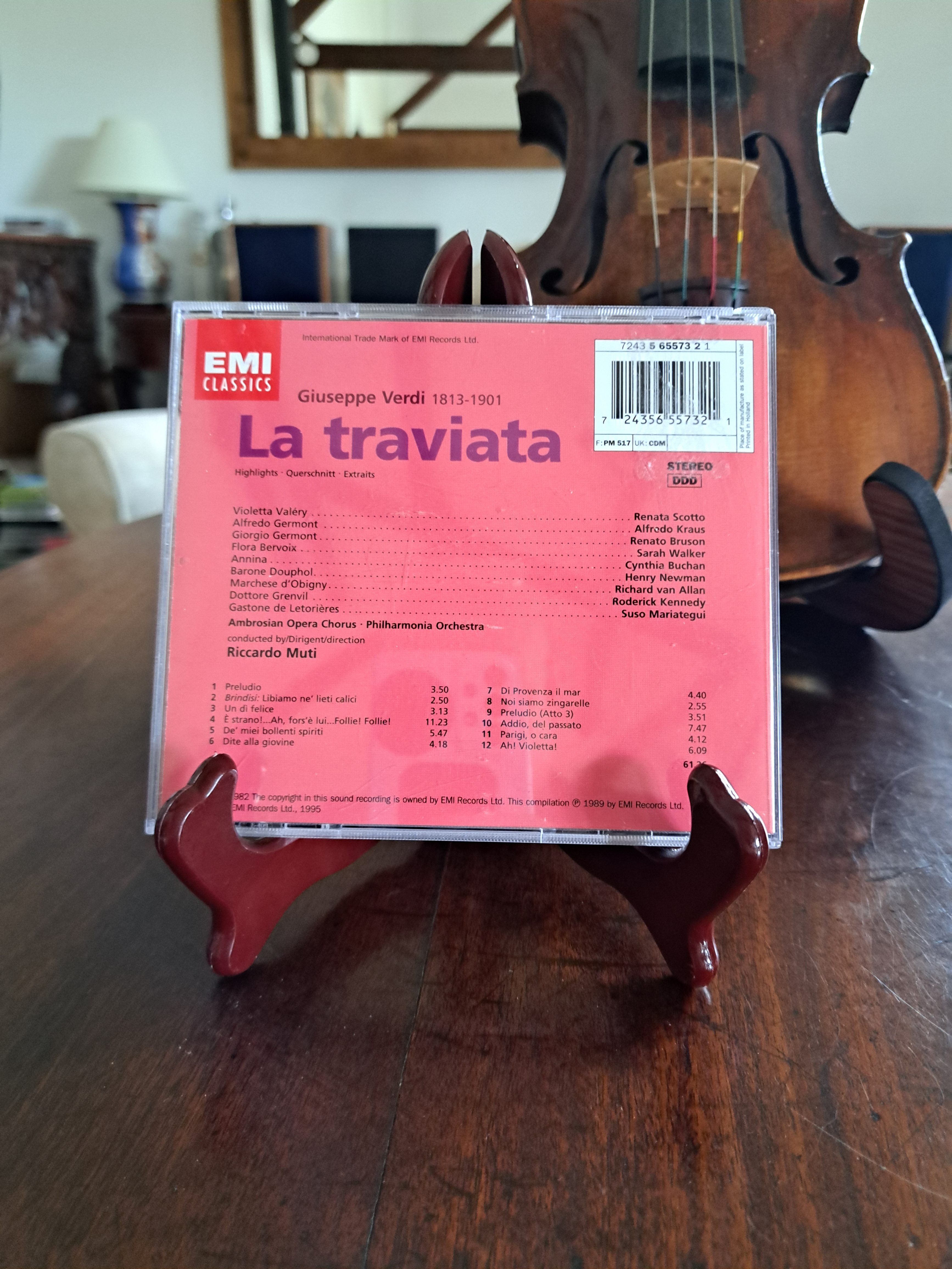 CD. EMI Classics. 61.26 minutes. La Traviata highlights. Violetta sung by Renata Scotto. Published 1989.