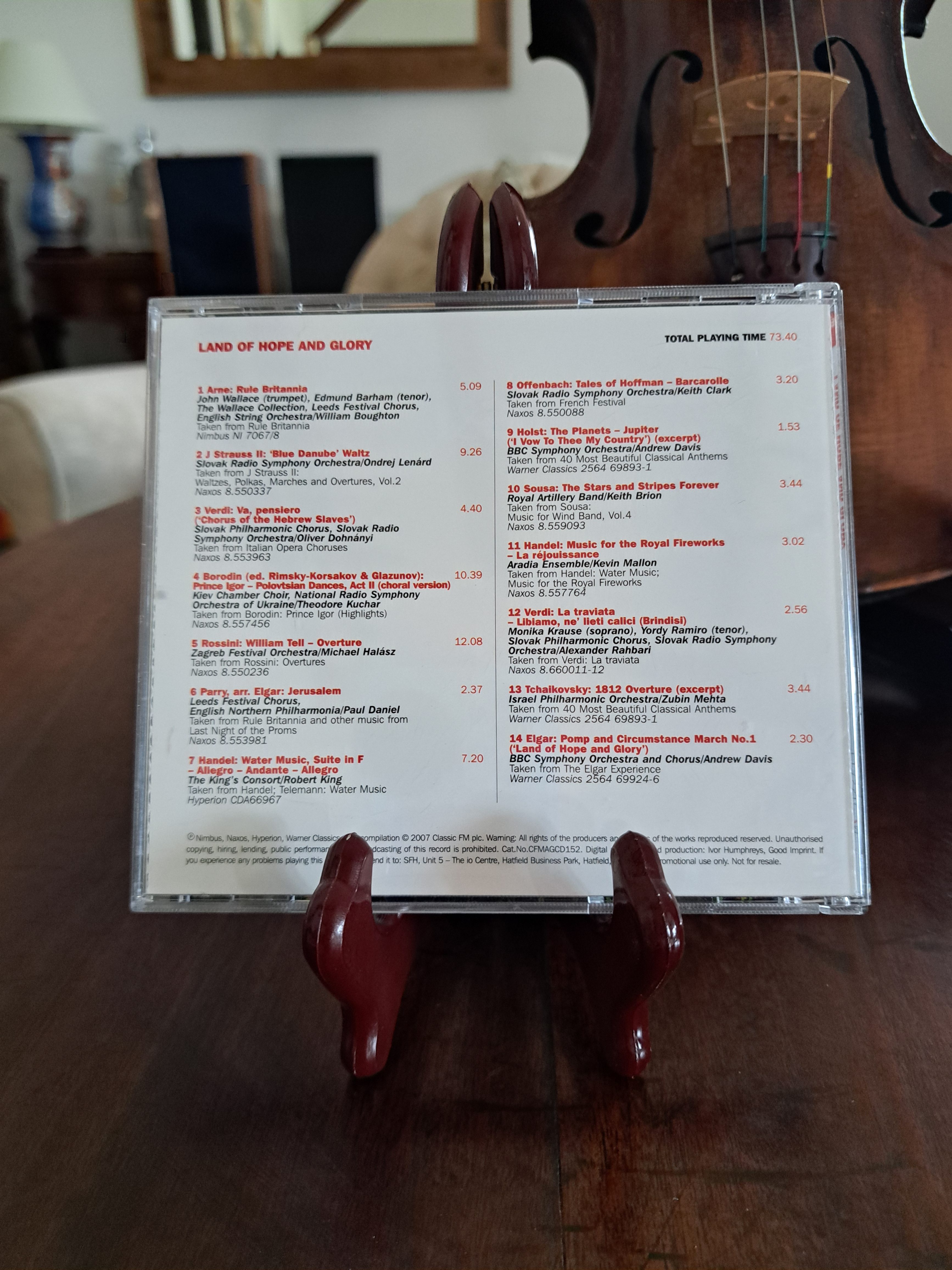 CD. Classic FM Evening Concert – Land of Hope and Glory. 14 festival favourites. Playing time 73.40 minutes. Published 2007.