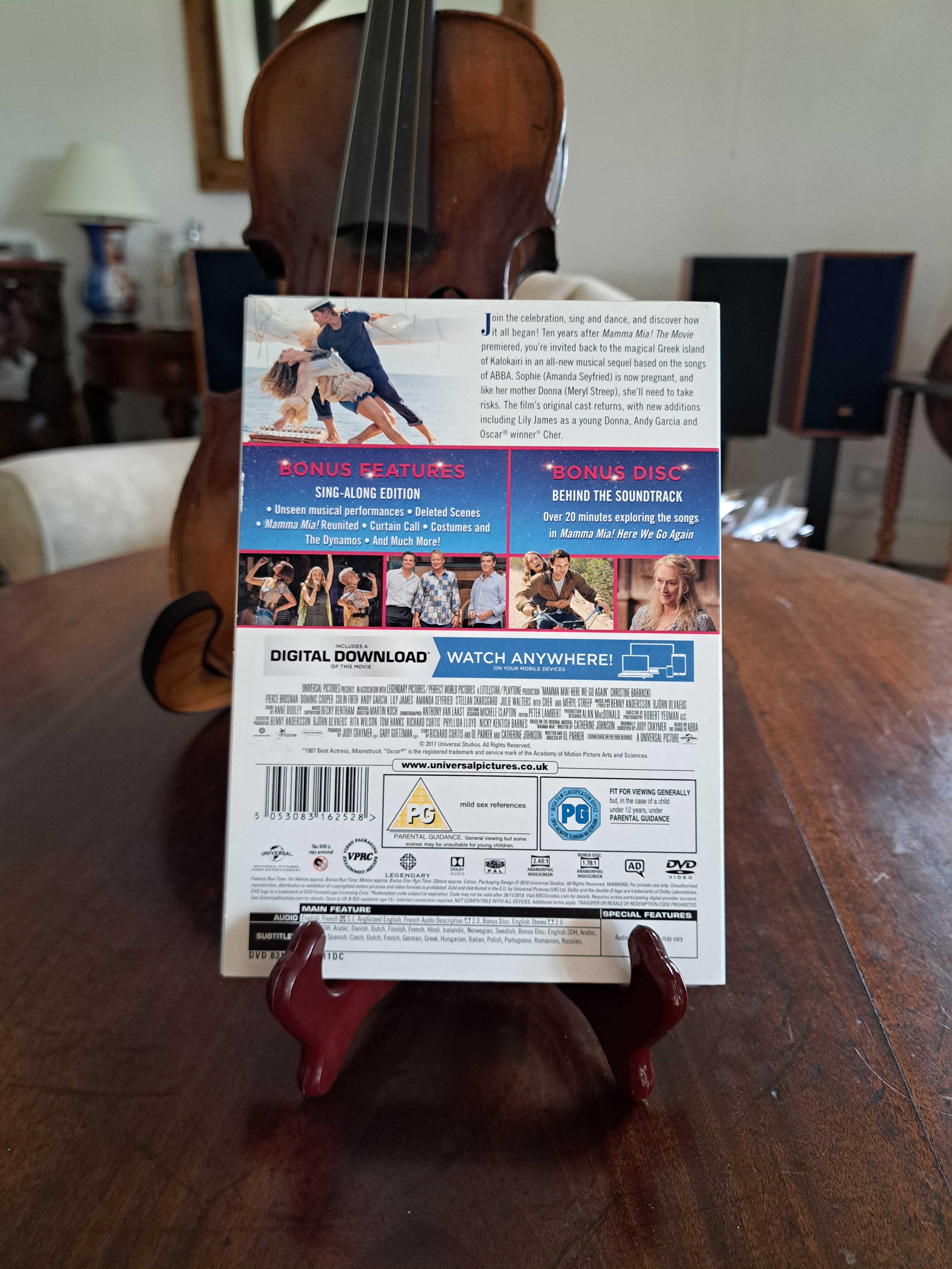 Sealed DVD with slip cover. 2 disc sing-along edition. Includes the original version of this super sequel plus over 75 minutes of bonus features. Ten years after Mamma Mia!, you’re invited back to the Greek island in an all-new musical sequel. 1 hour 54 minutes. Bonus 48 minutes.Piece Brosnan, Andy Garcia and Colin Firth are back!