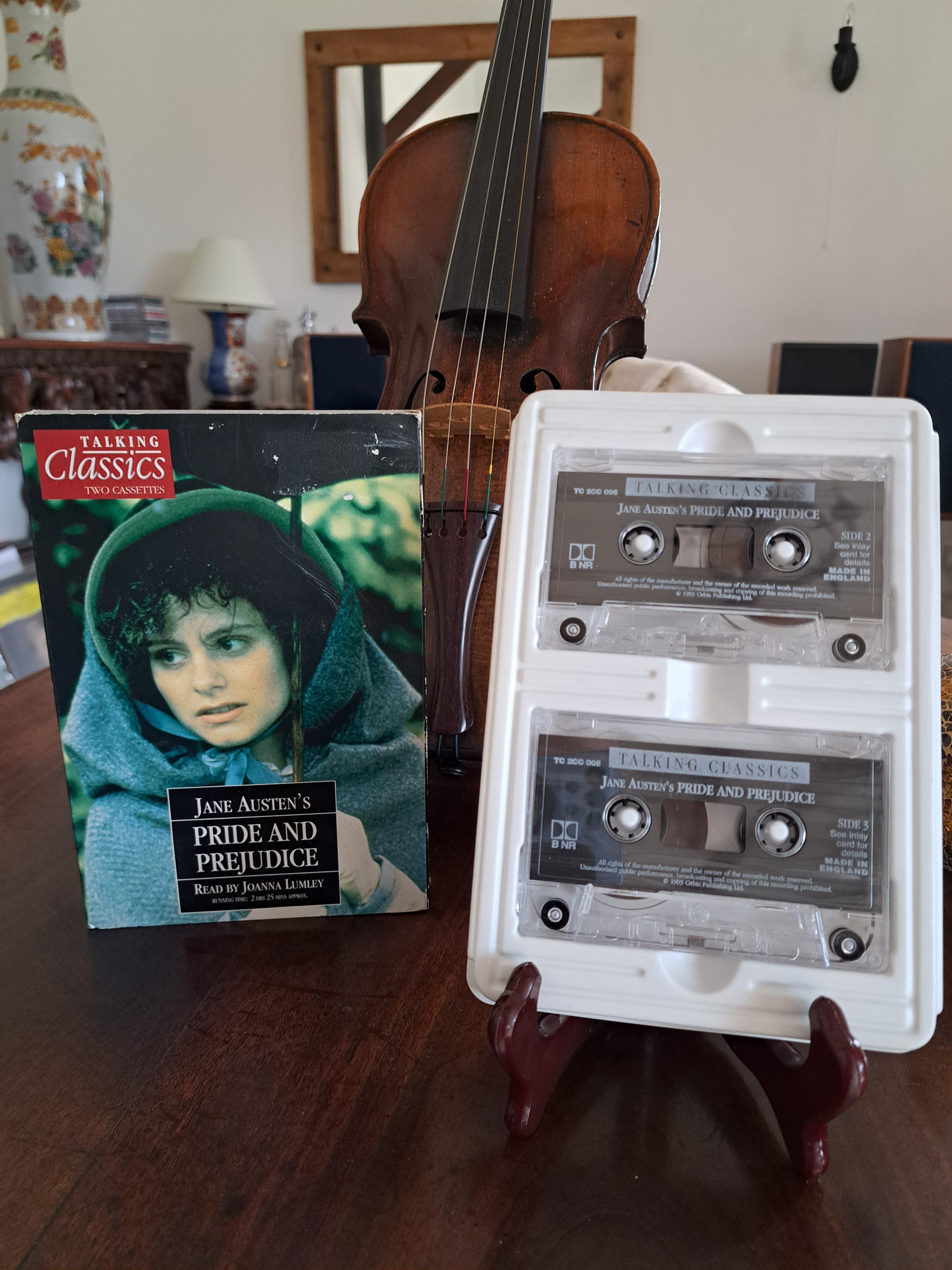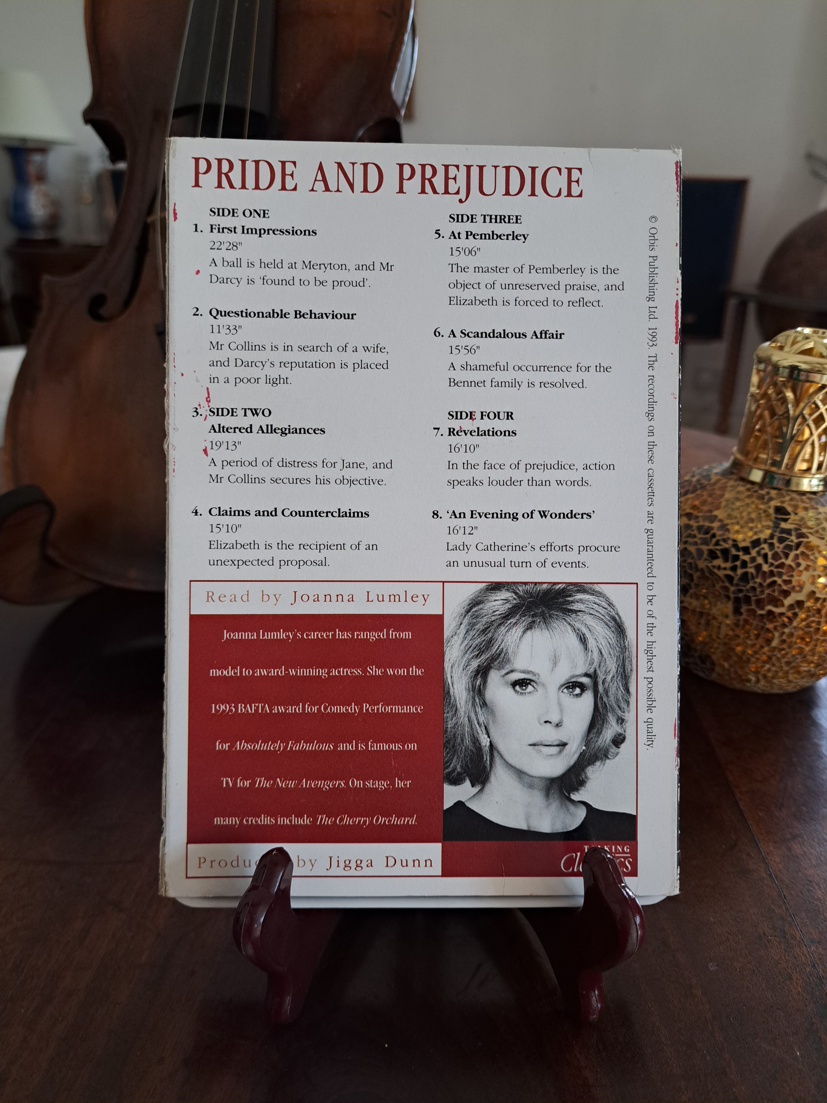 A twin cassette publication of the Talking Classics series – Pride and Prejudice by Jane Austen. Read by the inimitable Joanna Lumley. 2 hours 25 minutes. Orbis Publishing 1993. Sublime.