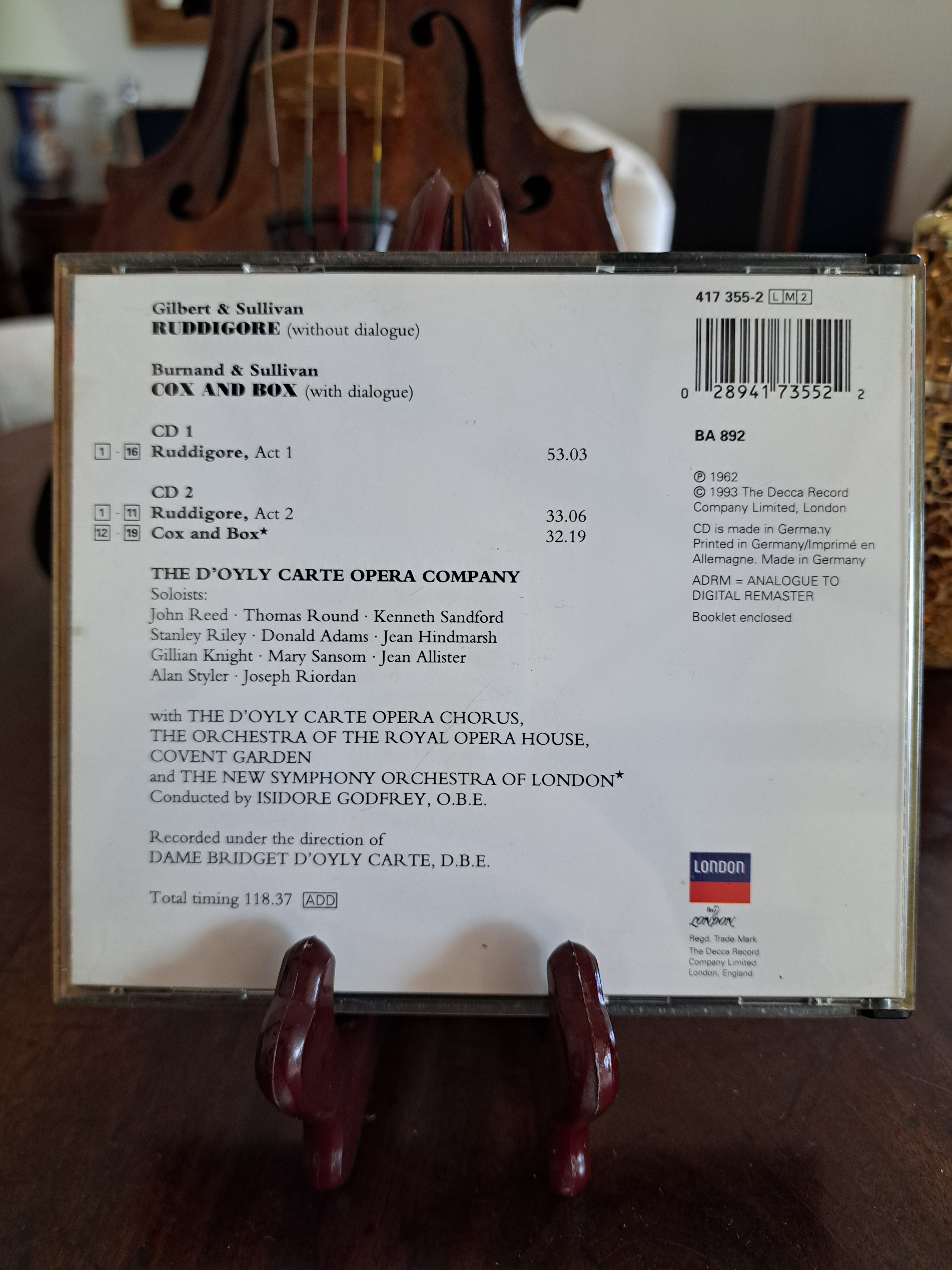 2 CD box set of Ruddigore (without dialogue on CD 1 ) and Cox and Box (with dialogue on CD 2). D’Oyly Carte Opera Chorus and the Orchestra of the Royal Opera House, Covent Garden. Total time 118.37 minutes. Recorded 1962, published 1993.