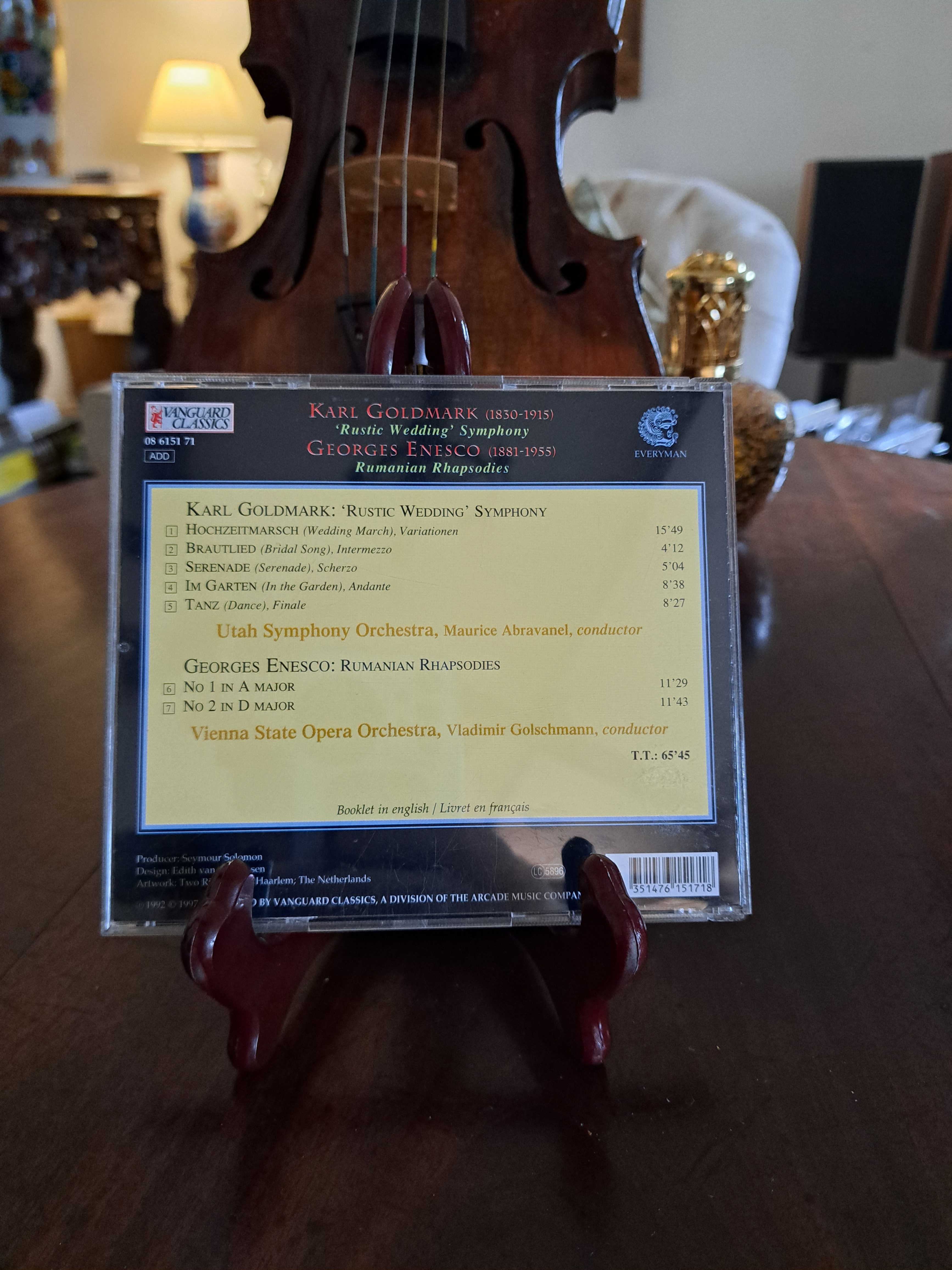 CD. Orchestral music. Rusting Wedding Symphony by Goldmark and Rumanian Rhapsodies by Enesco. Utah Symphony Orchestra and the Vienna state Opera Orchestra. 65.45 minutes. 7 tracks. Published 1997.