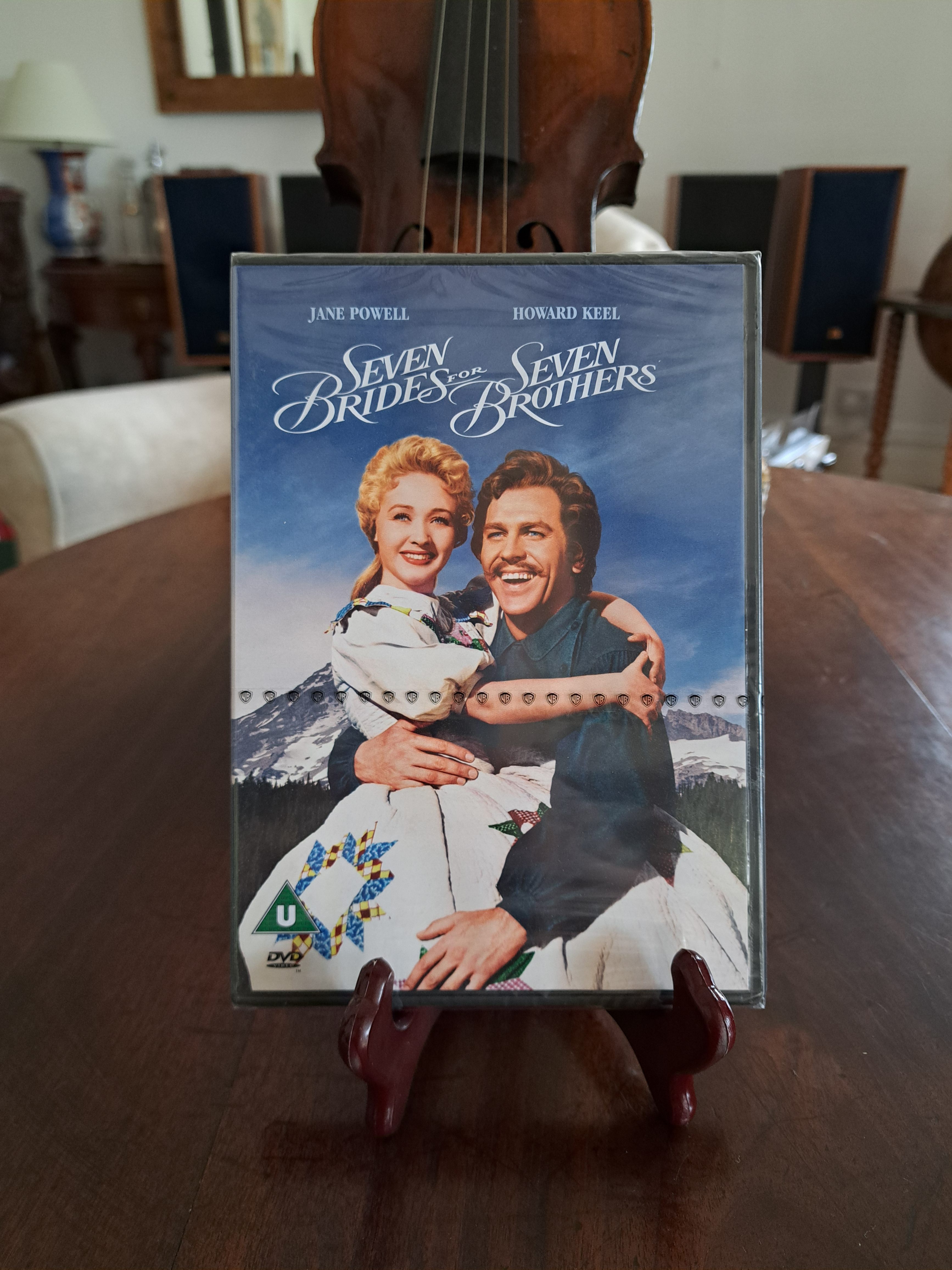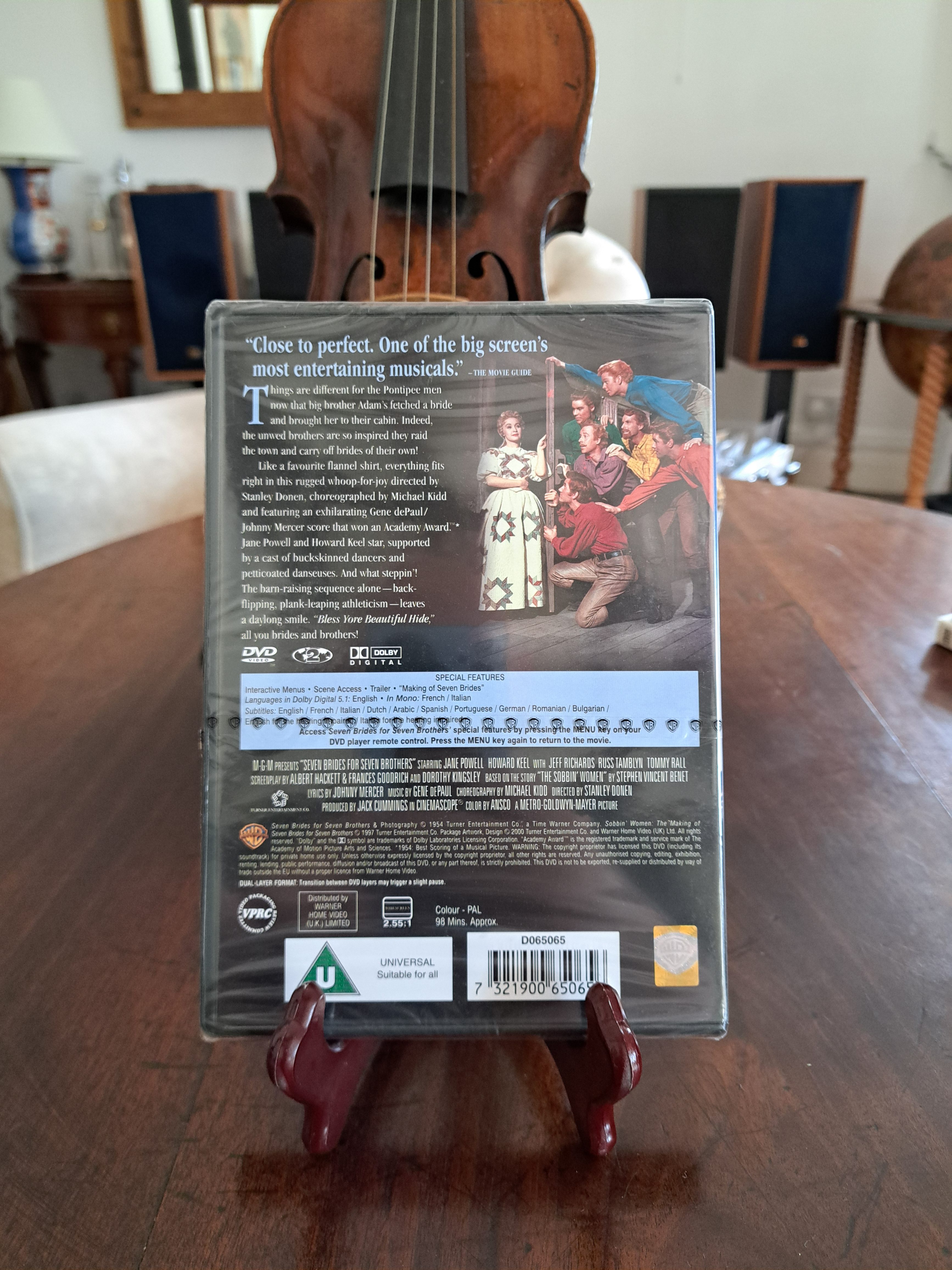 A still-sealed DVD of the legendary MGM 1954 version of Seven Brides for Seven Brothers. Starring Jane Powell and Howard Keel. Includes special features. Music by Gene de Paul. 98 minutes. 2:55:1 aspect ratio. Published 1997.