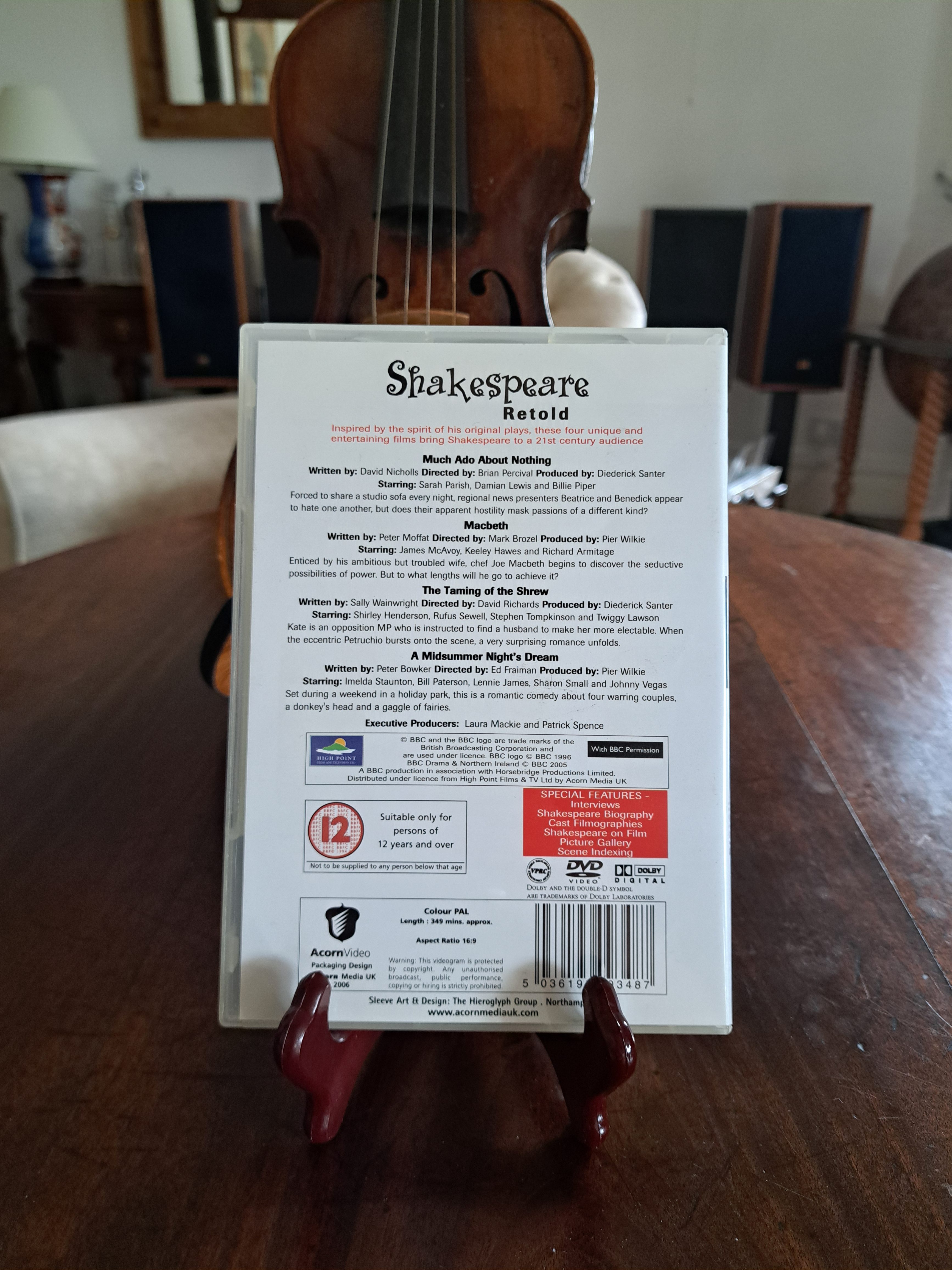 DVD. Four modern interpretations of Shakespeare plays. A superb contemporary cast including Rufus Sewell, Damian Lewis, Sarah Parish and Billie Piper. The plays are Much do About Nothing, Macbeth, The Taming of the Shrew and A Mid Summer Night’s Dream. 349 minutes. Widescreen. Includes special features. Published 2006.