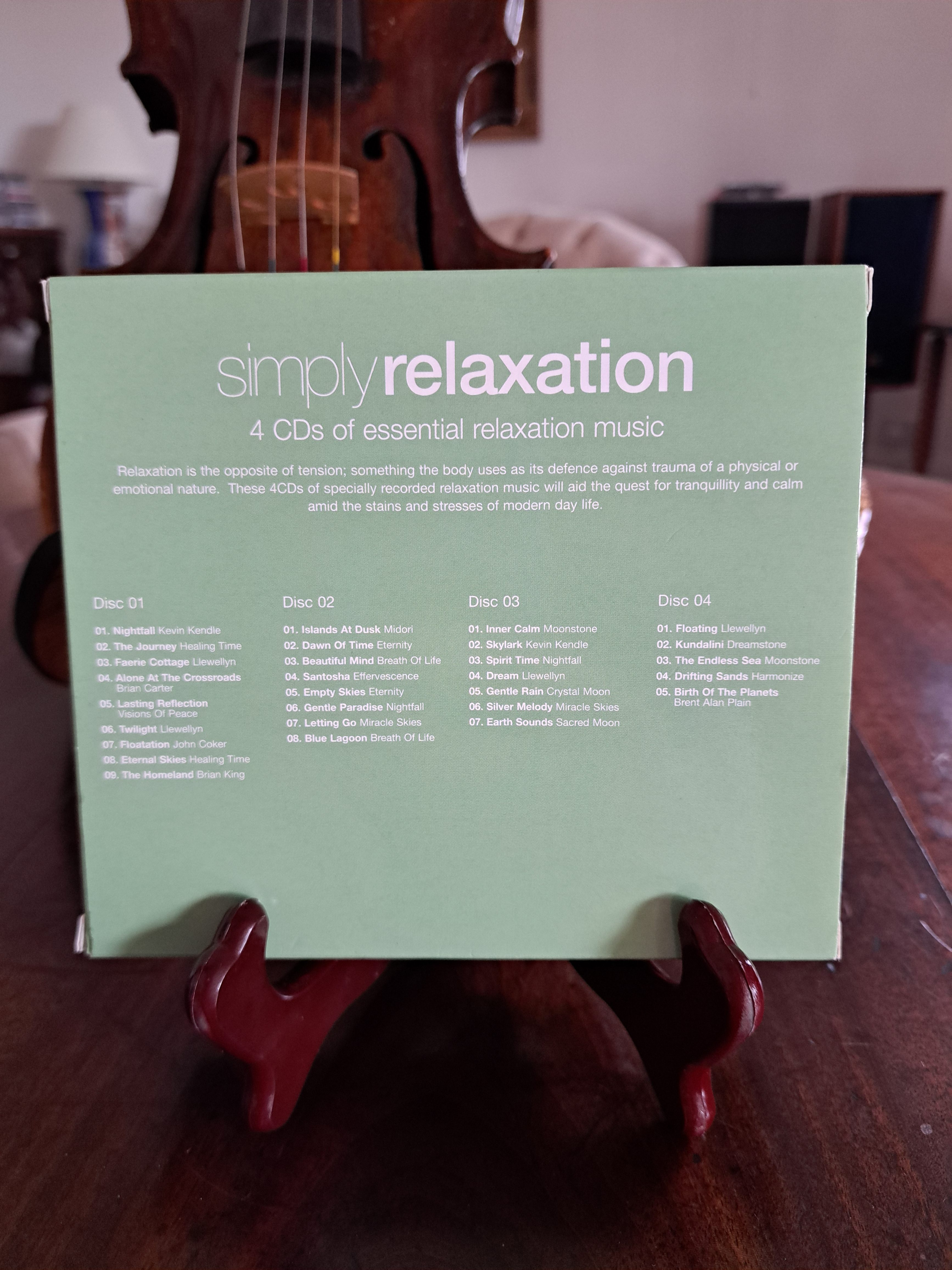 A 4 CD box set of essential relaxation music. Specially recorded relaxation music for tranquility and calm amid the strains and stresses of modern day life. 29 tracks. Published 2010.