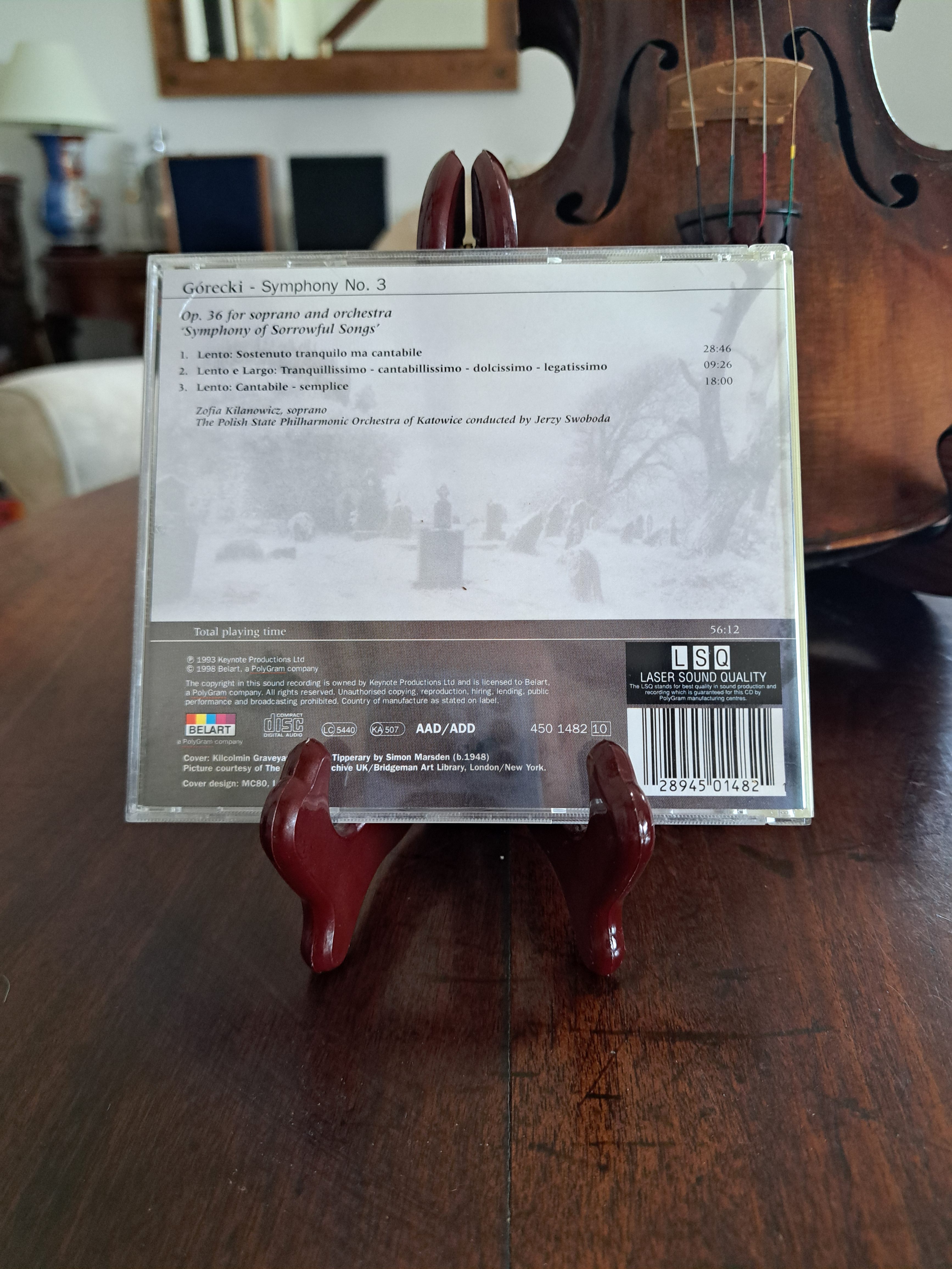 CD. Gorecki – Symphony Number 3. Symphony of Sorrowful Songs. Opus 36 for Soprano and Ochestra. Published 1998. 56.12 minutes.