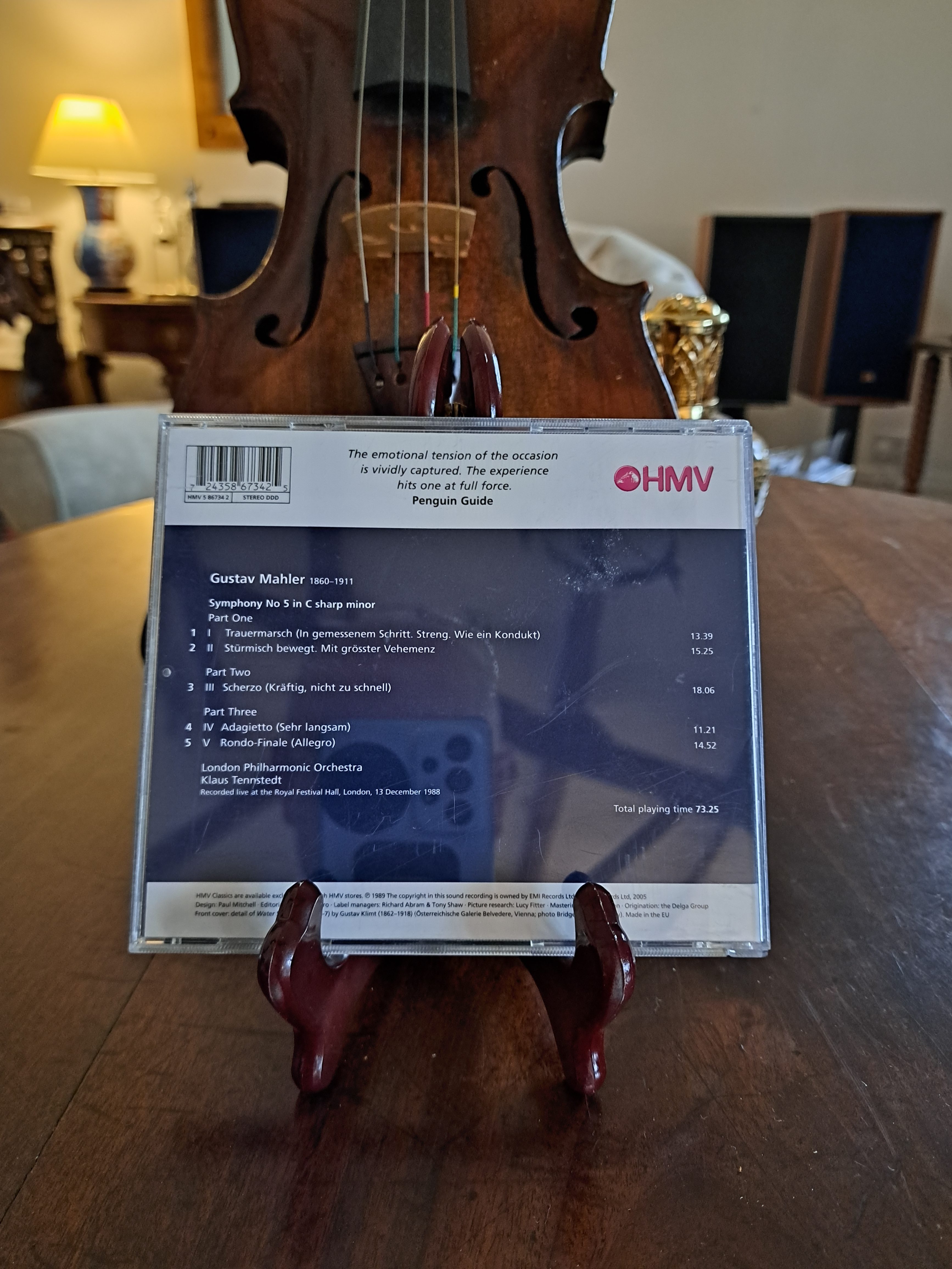 CD by HMV Classics. Symphony No. 5 by Mahler. 73.25 minutes. London Philharmonic Orchestra. Recorded at The Royal Festival Hall, December 1988.
