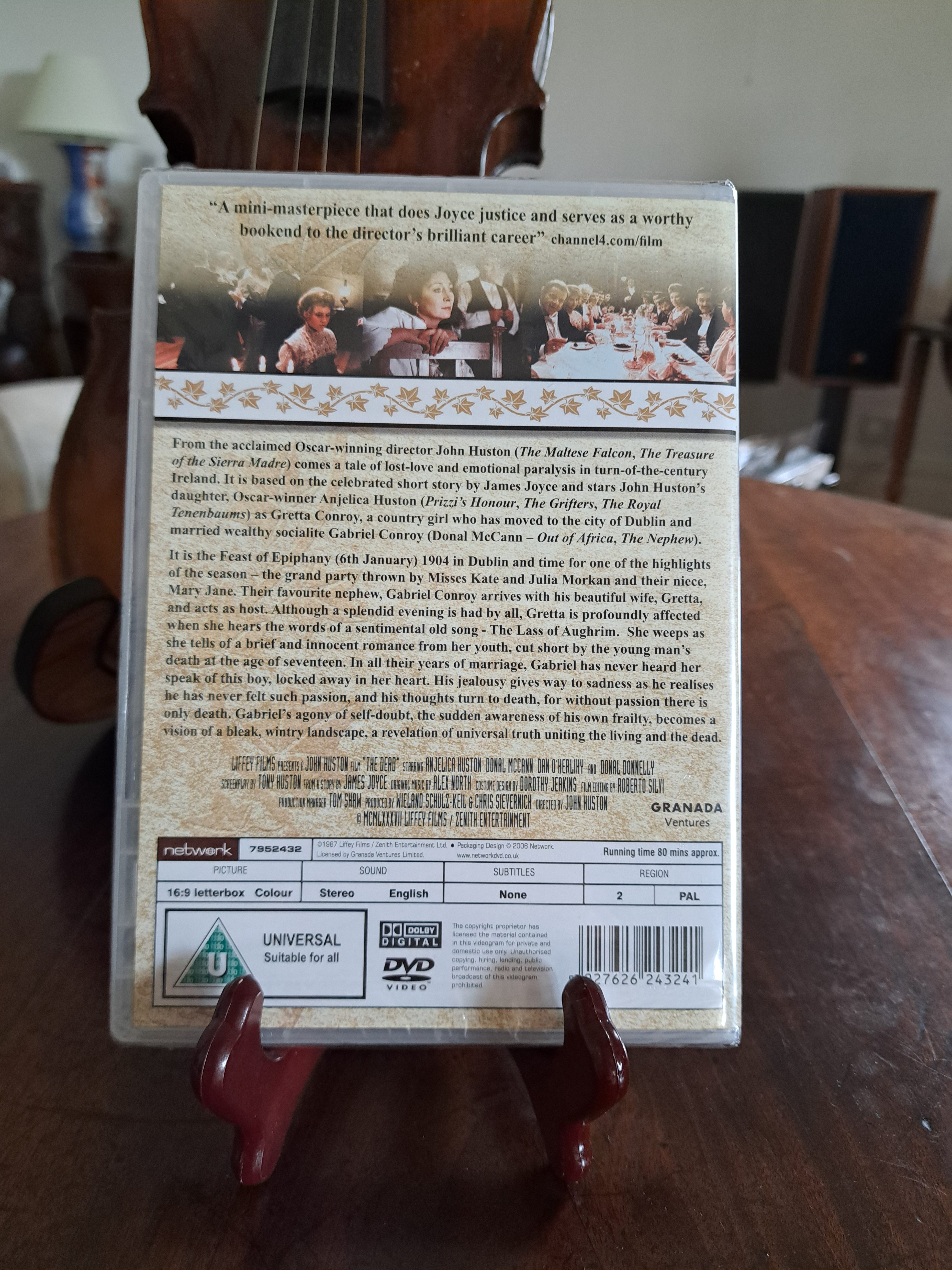 Sealed DVD: 1987 starring Angelica Huston and Donal McCann. A film by John Huston. A tale of lost-love and emotional paralysis in turn-of-the-century Ireland. Liffey Films. Based on short story by James Joyce. Aspect ratio 16:9 letterbox. Running time 80 minutes.