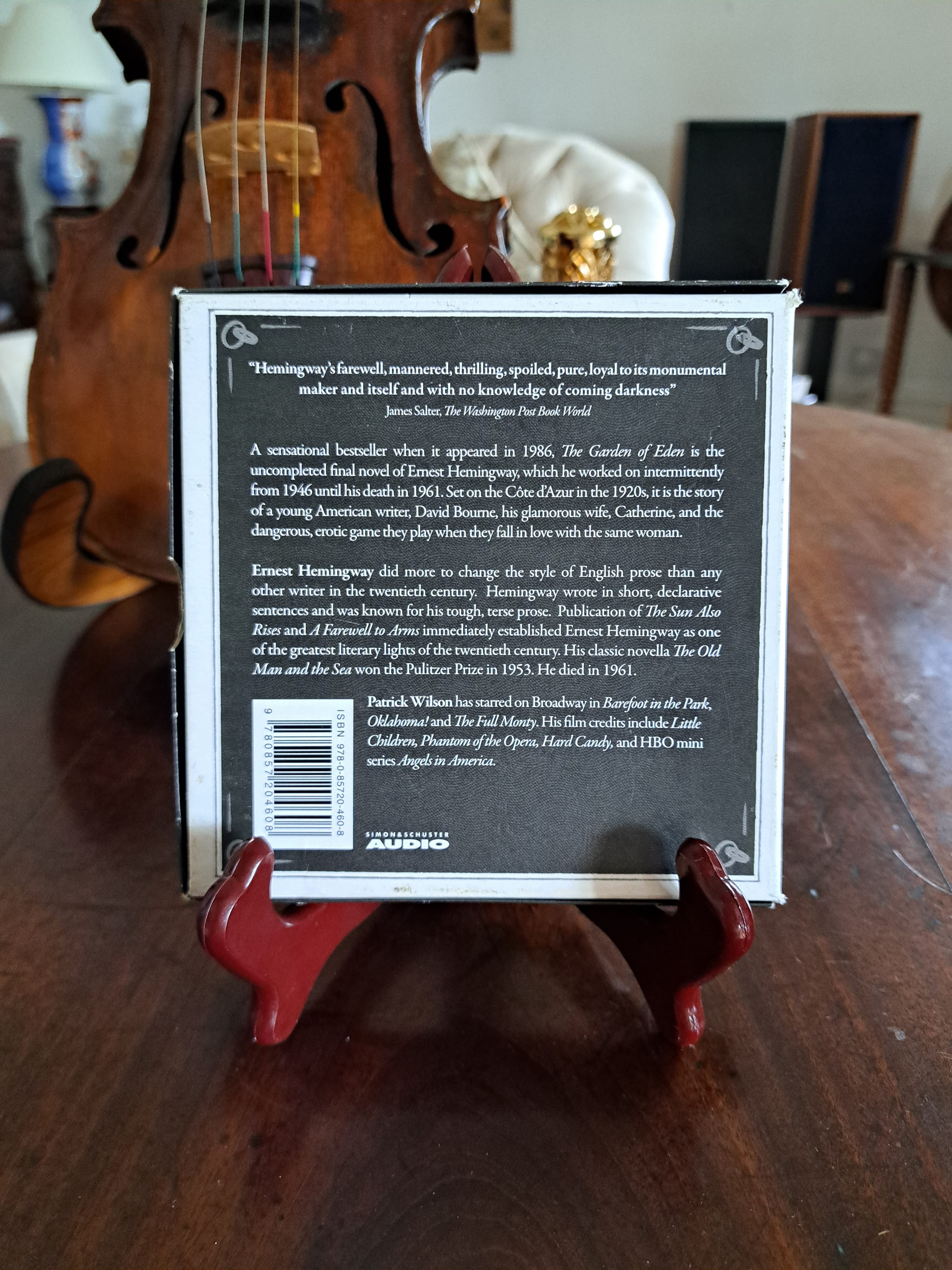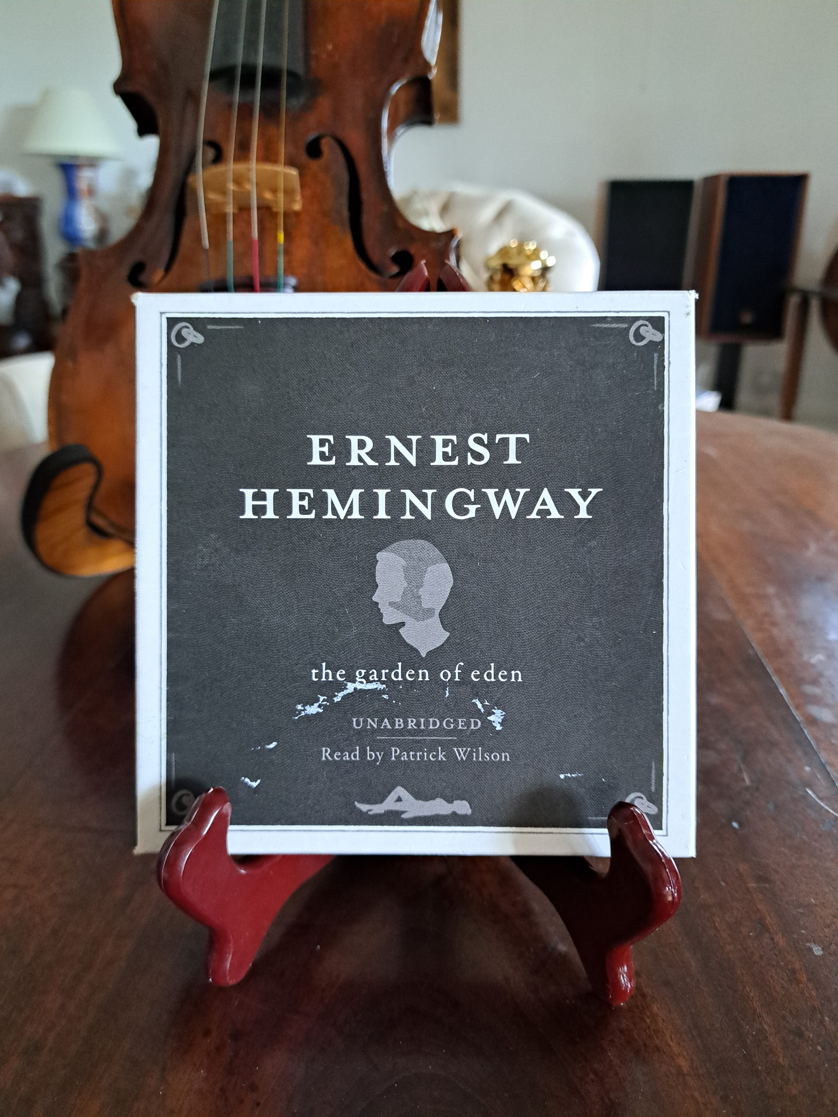 6 CD box set. Unabridged. The Garden of Eden by Ernest Hemingway red by Patrick Wilson. 7 hours. Simon & Schuster Audio. A sensational bestseller when it appeared in 1986, The Garden of Eden is the uncompleted final novel of Hemingway which he worked on between 1946 and 1961. Set on the Cote d’Azur in the 1920s.